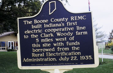 The Boone County REMC built Indiana's first electric cooperative line to the Clark Woody farm 5 miles west of this site with funds borrowed from the Rural Electrification Administration, July 22, 1935.