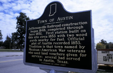 Jeffersonville Railroad construction began 1848, completed through here 1852. First station built on this site circa 1853 with two wood yards nearby for fuel. Official plat of Austin recorded 1853. Tradition is that town named by Mexican-American War veterans who used land vouchers given for service; several had served in Austin, Texas.
