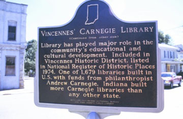 Library has played major role in the community's educational and cultural development. Included in Vincennes Historic District, listed in National Register of Historic Places 1974. One of 1, 679 libraries built in U.S. with funds from philanthropist Andrew Carnegie. Indiana built more Carnegie libraries than any other state.