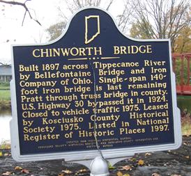 Chinworth Bridge Historical Marker (43.2007.1) was damaged October 2006 in an accident that nearly split the marker in half. It was repaired May 2007 in time for the Warsaw Greenway Dedication. The marker is located at Tippecanoe River Rest Park, Old US 30/Lincoln Highway at CR 350 W, in Warsaw.