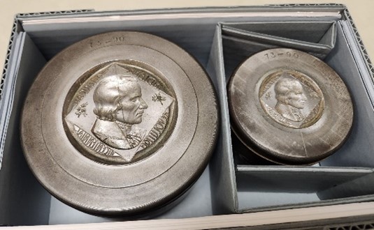 8.) The Indiana State Seal and the American Revolution Bicentennial Celebration Medal printing dies come from the 1970s American Revolution Bicentennial Commission records. After ‘discovery,’ these dies were placed into custom boxes with a warning label about how heavy they are.