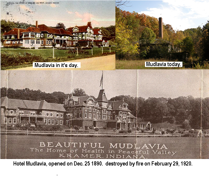 Near the small town of Kramer, the Hotel Mudlavia once had an international reputation. Built in 1890 at a cost of $250,000,it drew guests from around the world. Famous people such as James Whitcomb Riley, John L. Sullivan and Harry Lauder are known to have stayed at the hotel.