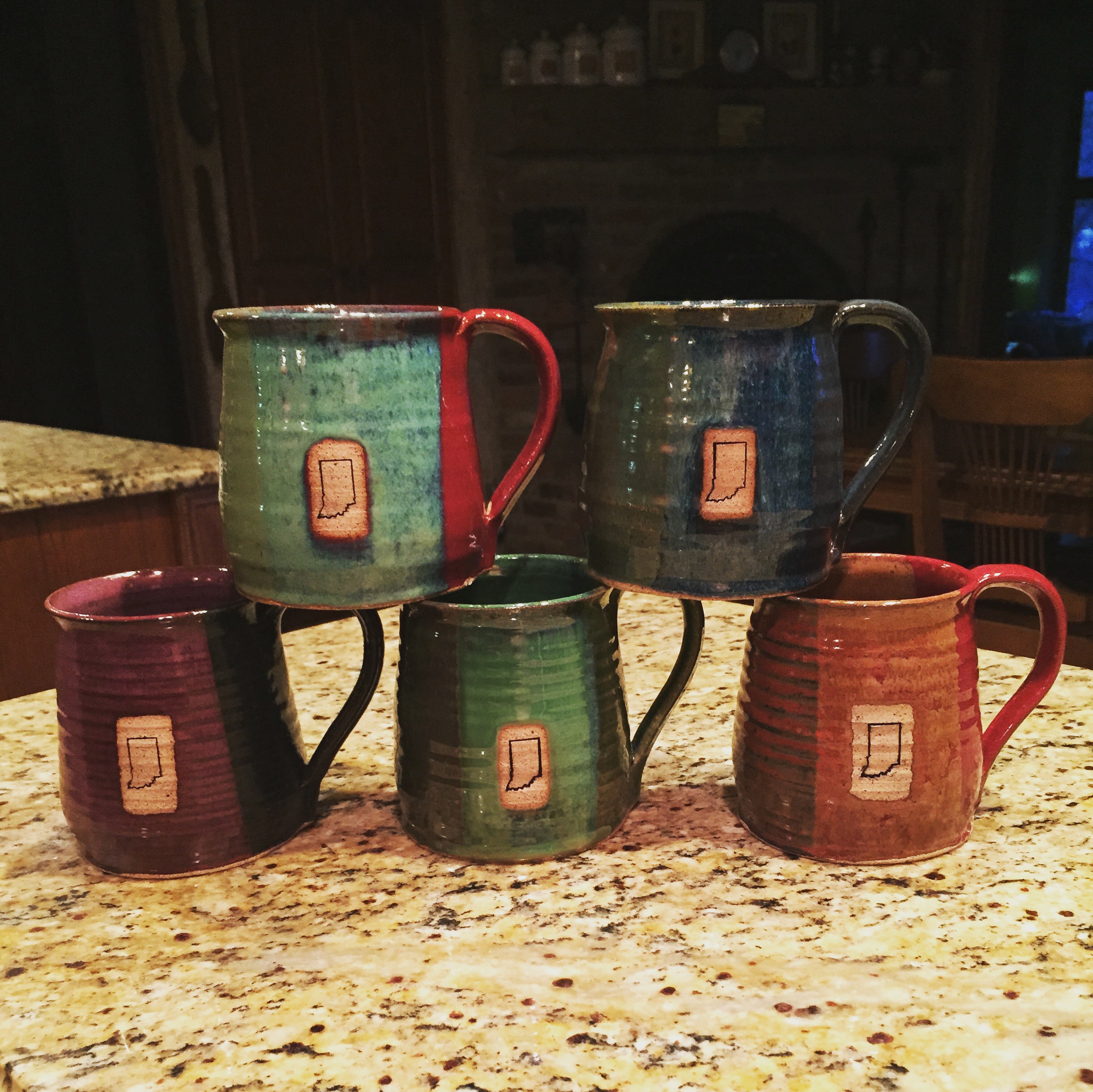 Handmade wheel thrown stoneware pottery mug with state of Indiana stamped on the front.