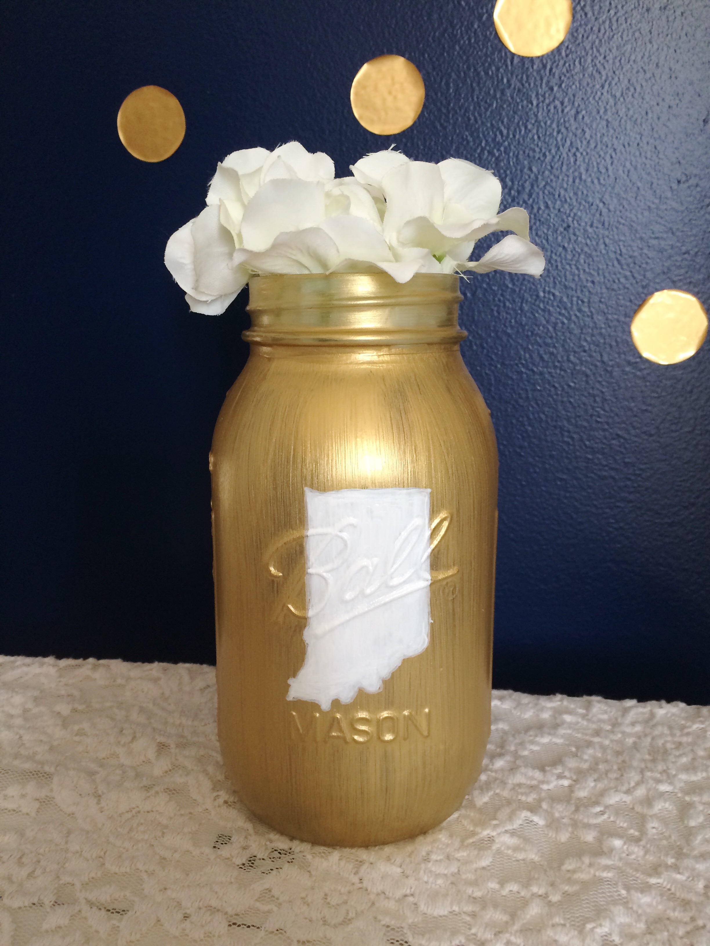 This hand painted satin gold Ball Mason jar featuring a white Hoosier state is the perfect way to commemorate Indiana's Bicentennial in your home. This jar would add a perfect touch of Hoosier pride displayed on a shelf, on a table as a centerpiece, as a vase, or as a great gift for an Indiana fan.