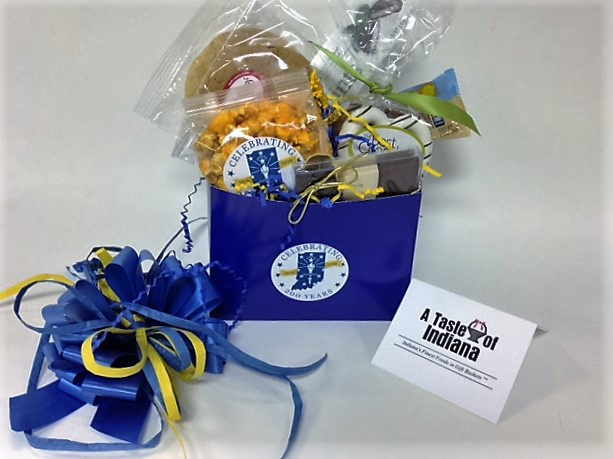 A Taste of Indiana's Bicentennial Box is filled with delicious Indiana-made food products. It is decorated in Indiana's blue and yellow colors.