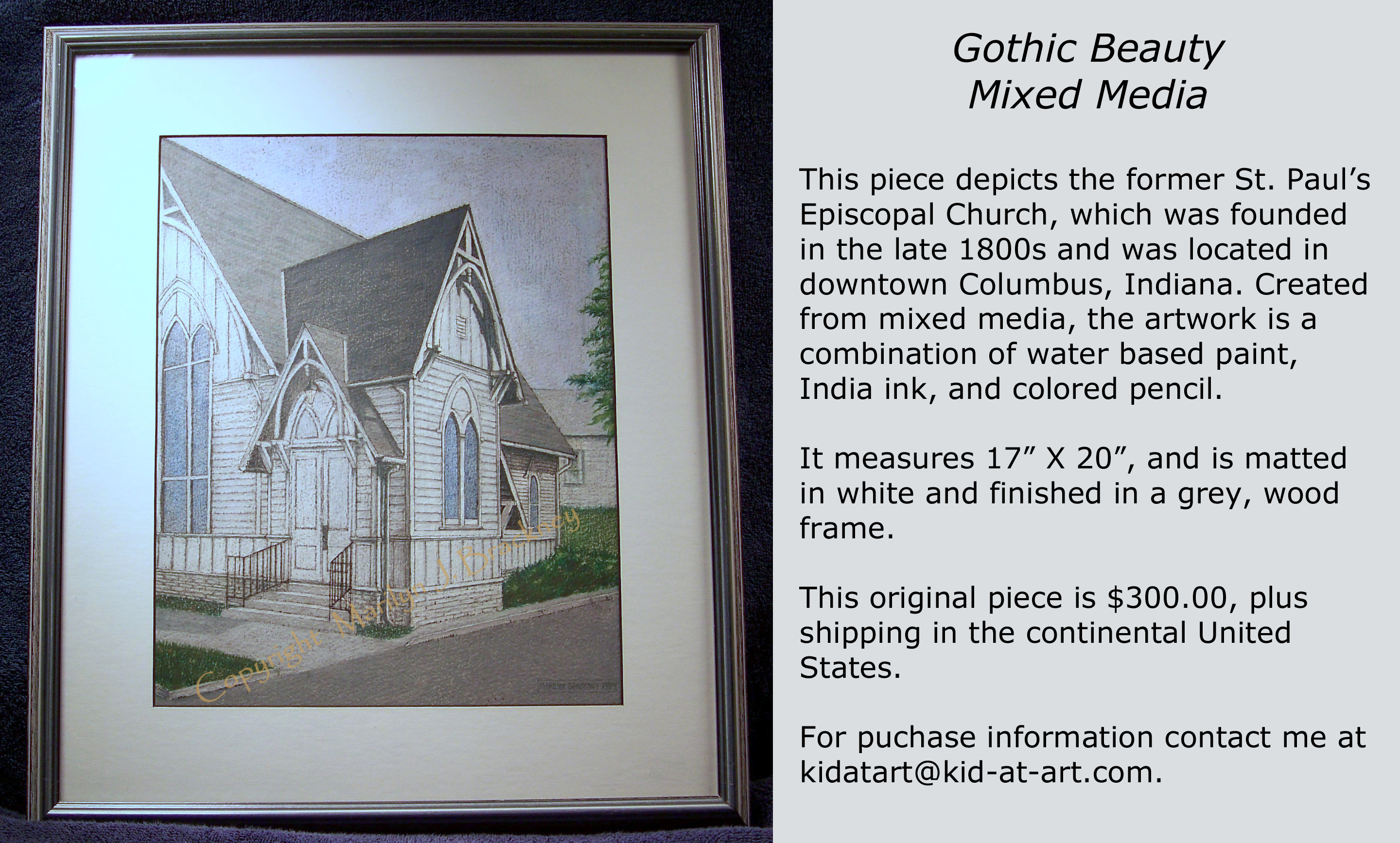 This original piece depicts the former St. Paul’s Episcopal Church, which was founded in the late 1800s and was located in downtown Columbus, Indiana. Created from mixed media, the artwork is a combination of water based paint, India ink, and colored pencil, and it's matted in white and finished in a grey, wood frame.