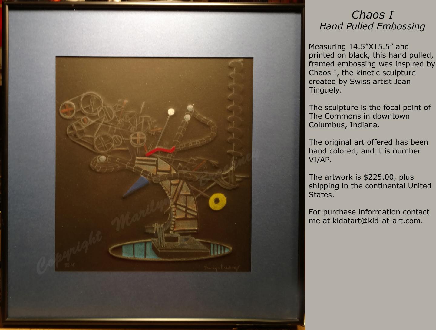 Printed on black, this hand pulled, framed embossing was inspired by Chaos I, the kinetic sculpture created by Swiss artist Jean Tinguely. The sculpture is the focal point of The Commons in downtown Columbus, Indiana.