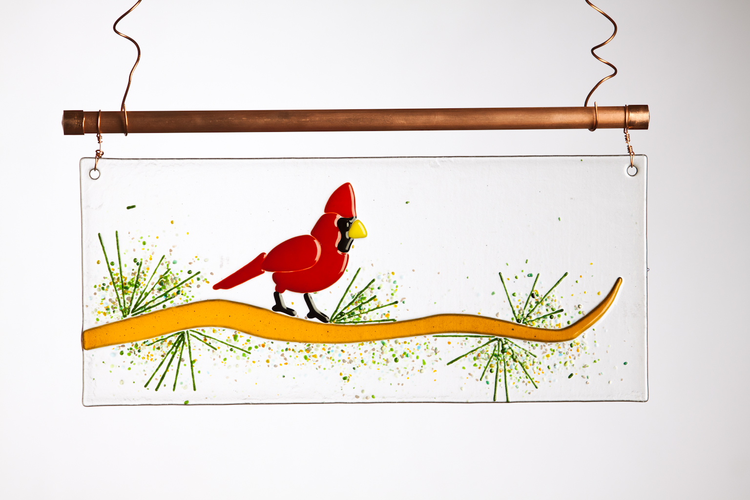 I hand cut the glass and then begin working on the design, in this case, the bird. I cut and grind the red glass, perch the lovely on a brown glass branch and pepper liberally with a custom color blend of frit (ground glass). The piece is then fired and properly annealed in my digitally controlled kilns.