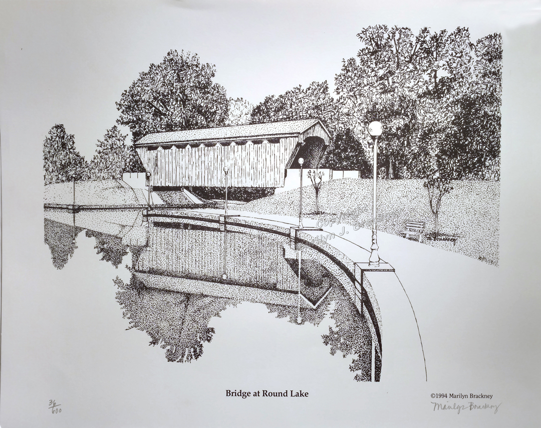 Depicting one of 30 covered bridges still standing in Parke County, Indiana, this pen and ink drawing by K.P. Singh evokes the charm of a slower, less hectic, time.