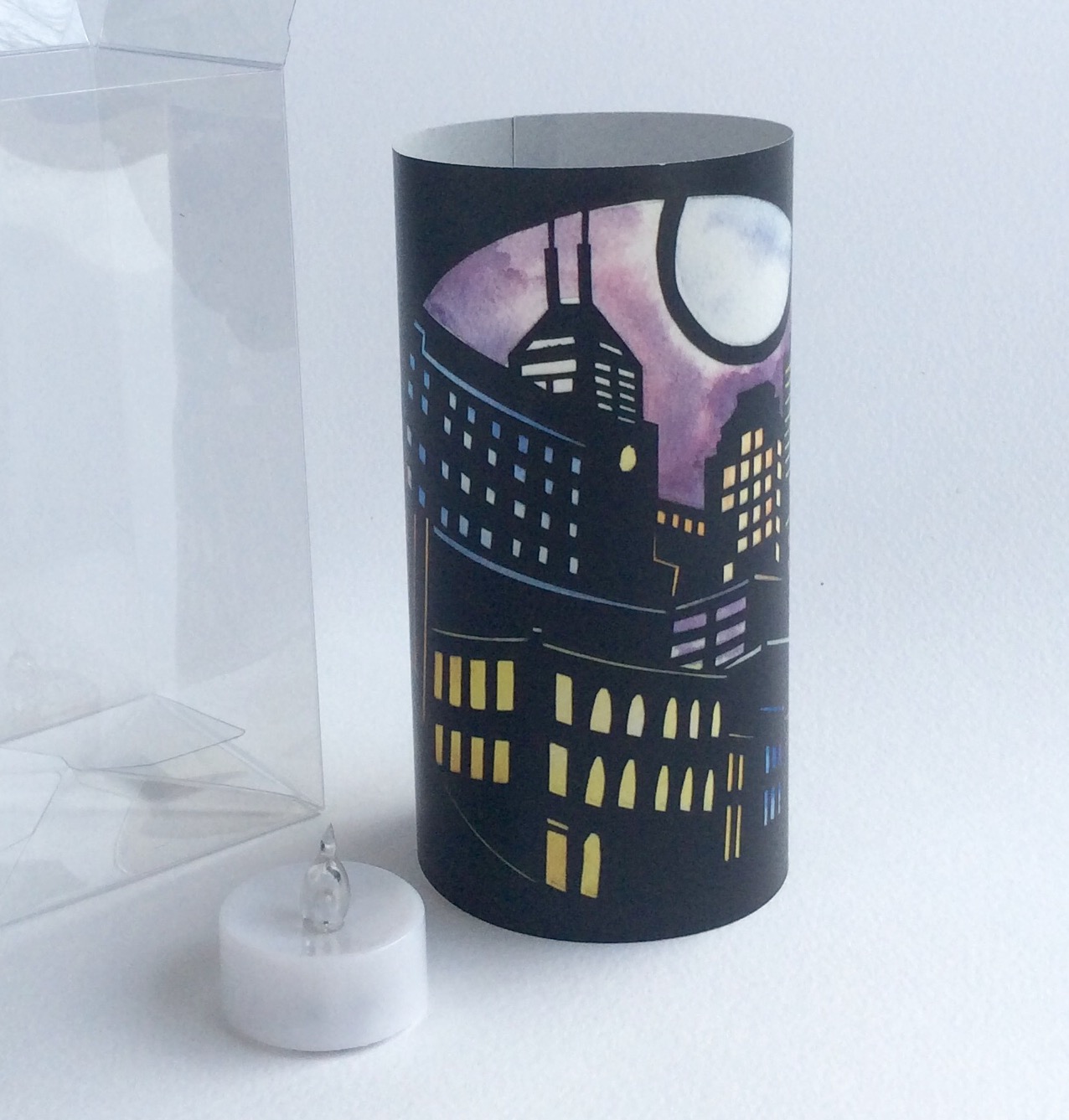 "Peace" (Monument Circle, Circle of Lights) Watercolor & Black Acrylic Cut-Paper Luminaries by Elizabeth Seagull Heeter.