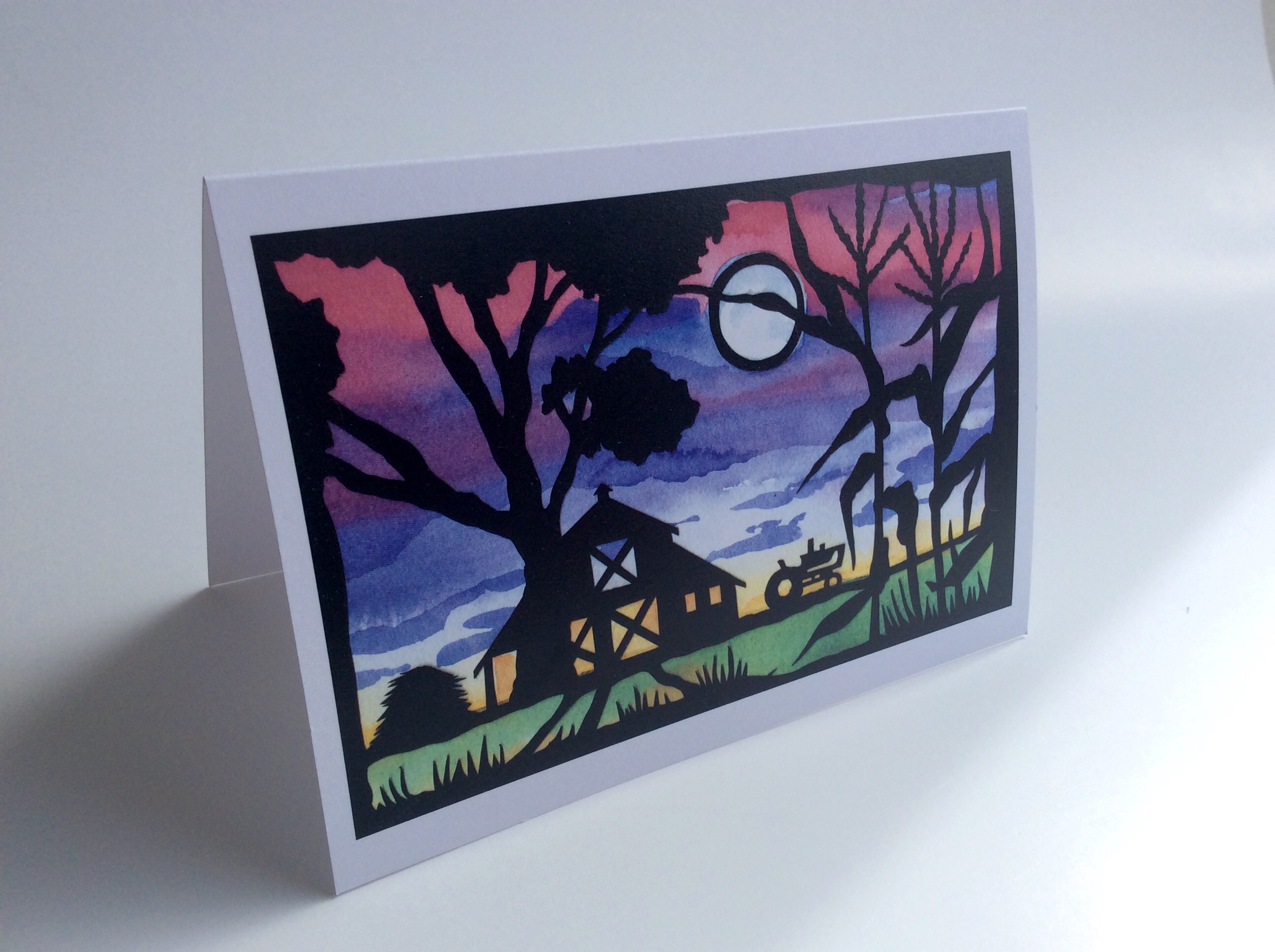 This painting celebrates Indiana's farming families who support our communities with the food they produce. Indiana has beautiful farms often with picturesque old barns. I always look forward to family road trips to capture barn images along our way. These cards are prints of my original cut-paper and watercolor designs.
