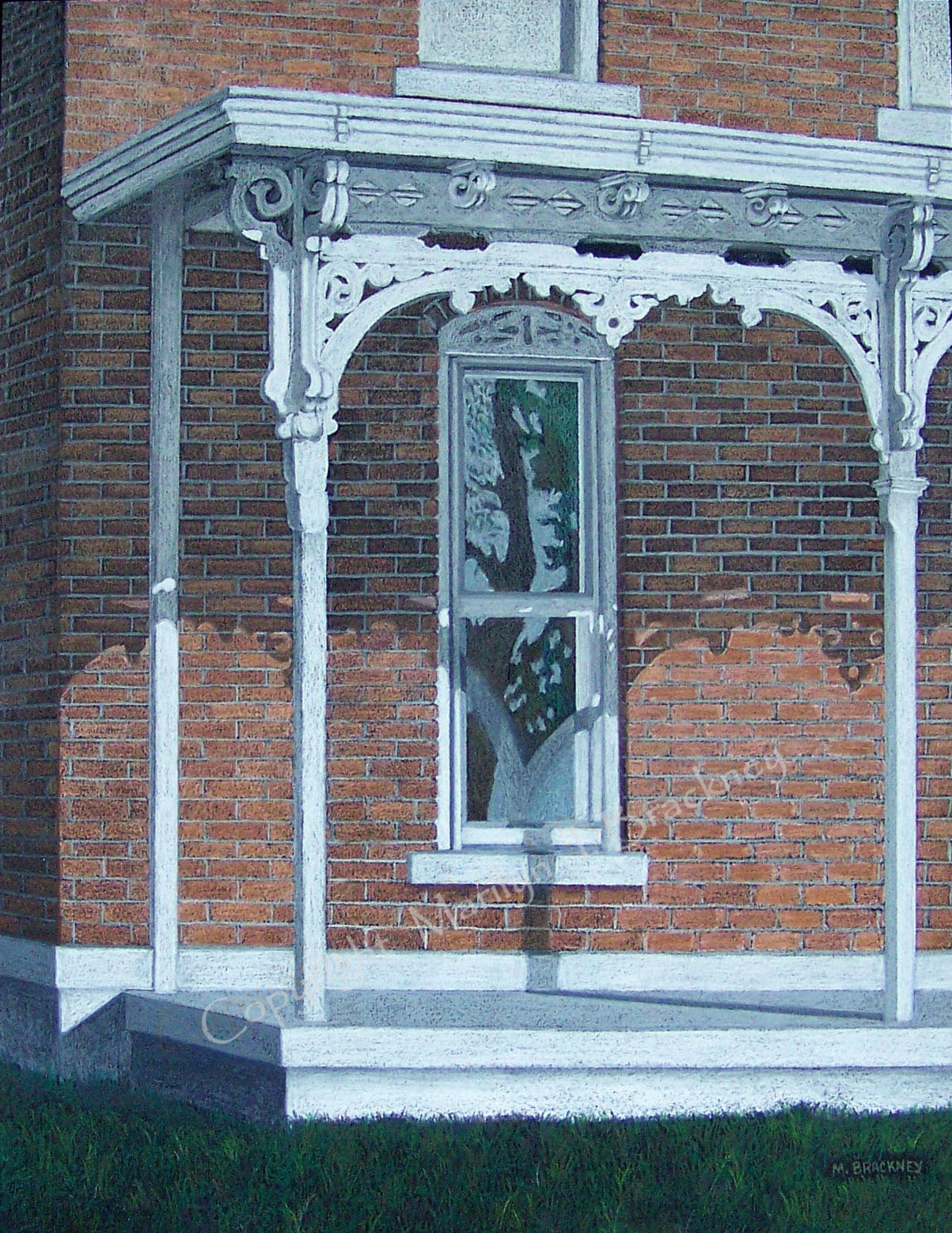 This print was made from an original, colored pencil drawing of a 19th Century home. Clay for the bricks was dug and fired on the property, which is located in Decatur County. The delicate gingerbread trim on the porch casts an interesting shadow, and it inspired the title Shadows and Lace.