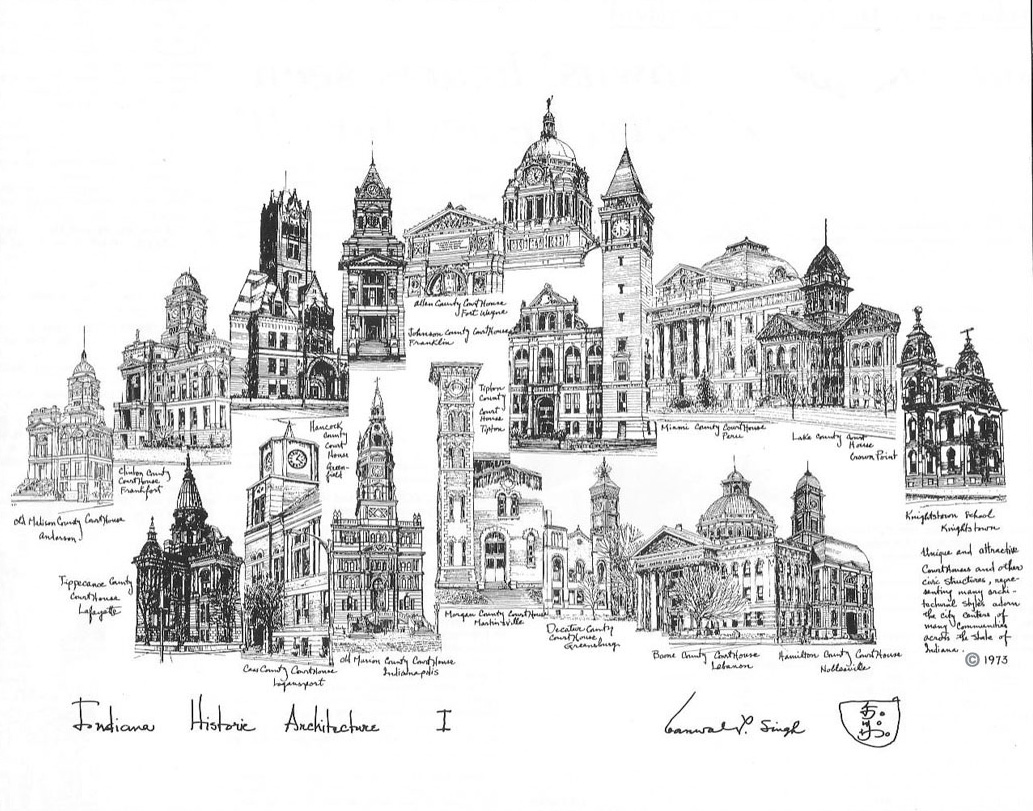 Historic architectural sites, featuring county courthouses and civic structures found in Indiana, are rendered in this beautiful pen and ink drawing.