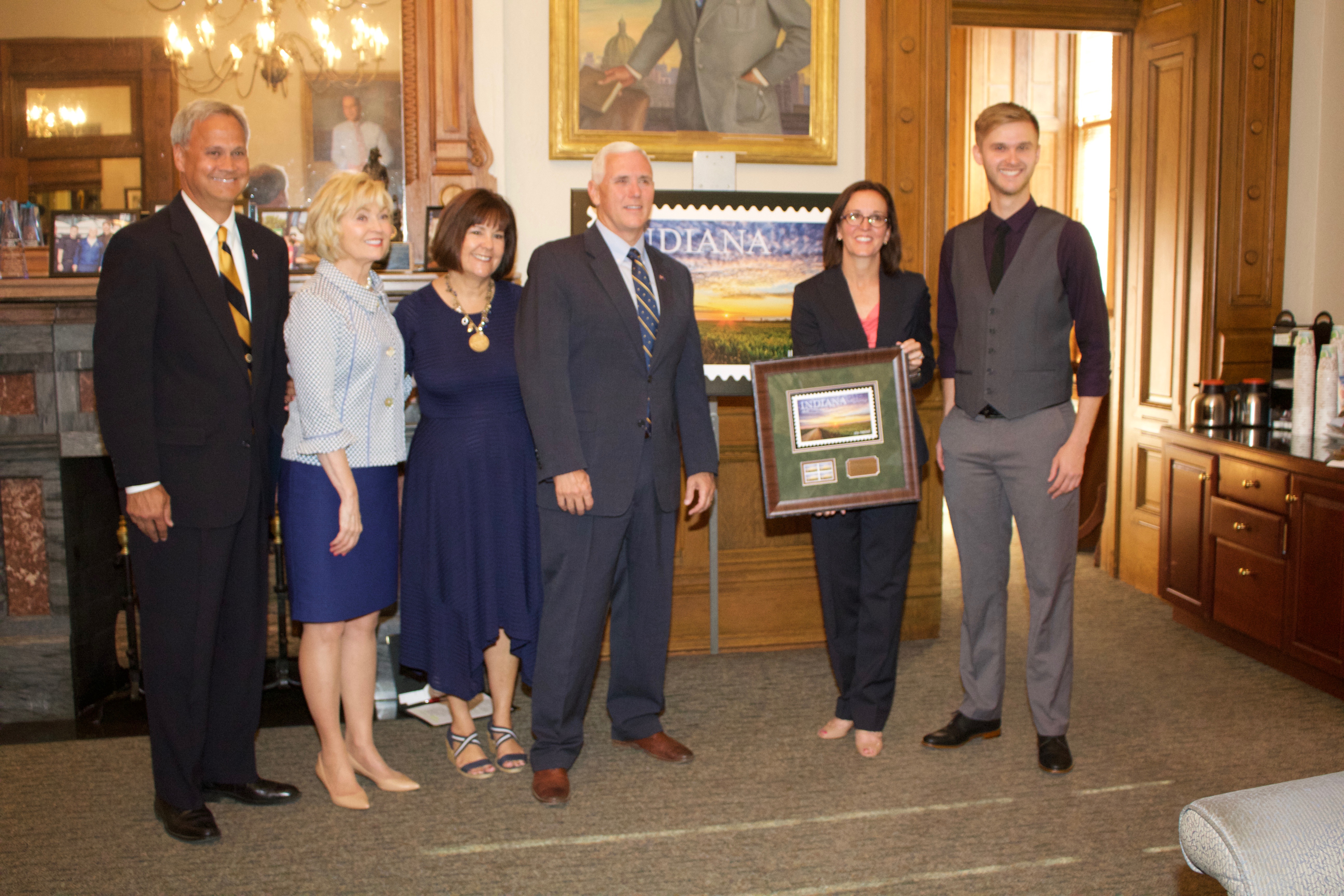 The Indiana Bicentennial stamp was issued on June 7, 2016 at the Indiana Statehouse. The First Day of Issue event was open to the public. The Bicentennial stamp depicts an Indiana sunset over a cornfield on a country road, a memory every Hoosier can recall. The picture illustrated on the stamp was taken by Michael Matti, a native of Milford, Ind.