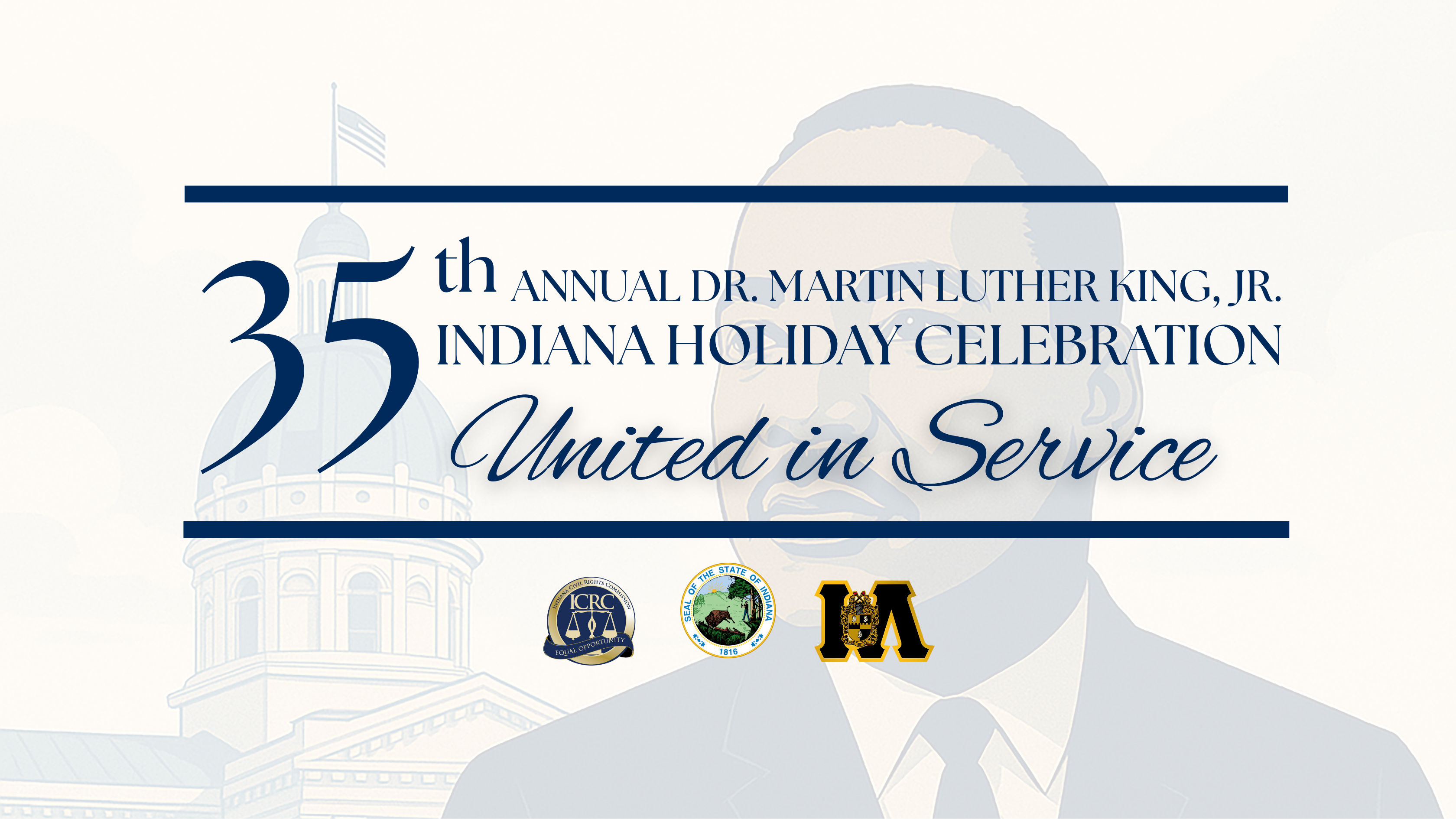 The Indiana Civil Rights Commission invites you to join us for the 35th Annual Dr. Martin Luther King Jr. Indiana Holiday Celebration on Thursday, January 15, 2026, from 12PM – 1PM at the Indiana Statehouse. Each year we gather with partners, community members, and state leaders to honor the life and legacy of Dr. King and to reflect on the work that continues to move Indiana forward.