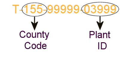 - Plant ID - The plant ID is a five-digit number used in conjunction with the county code to identify the facility. The plant ID will generally be the last five numbers of the permit number. Below is an example of a permit number with the County Code and the Plant ID pointed out.