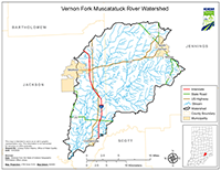 The Vernon Fork Muscatatuck River Watershed covers approximately 212 square miles in Southeast Indiana and is in Jackson and Jennings counties. The six subwatersheds included in the Total Maximum Daily Load (TMDL) report are Mutton Creek, Storm Creek, Sixmile Creek, Grassy Creek, Polly Branch, and Indian Creek.
