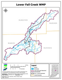 The Lower Fall Creek watershed is located in the most populated and fastest growing areas of Indiana. The Lower Fall Creek watershed drains approximately 66,000 acres (103 square miles) of rural, suburban, and urban land in Central Indiana. The watershed covers portions of Hamilton County (City of Noblesville, City of Fishers), Hancock County (Town of McCordsville), Madison County, and Marion County (City of Indianapolis, City of Lawrence). Within the Lower Fall Creek watershed, there are over 800 miles of streams and tributaries. The Lower Fall Creek watershed consists of four sub-watersheds- Headwaters Mud Creek (HUC 051202010901), Indian Lake – Indian Creek (HUC 051202010902), Sand Creek – Mud Creek (HUC 051202010903), and Devon Creek – Fall Creek (HUC 051202010904). The majority of land use in the project watershed is developed (60%) and agriculture (31%) with forest at 7%.