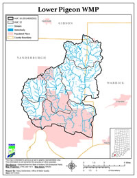 The Lower Pigeon Watershed (LPW) covers 68,700 acres in Vanderburgh, Gibson, Pike, and Warrick Counties in southwest Indiana. The LPW is made up of seven watersheds that each has a 12-digit Hydrologic Unit Code (HUC) area.