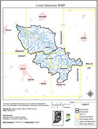 The Lower Salamonie River Watershed Management Plan (WMP) provides a framework for addressing water quality issues within two 10-digit HUCs (0512010203, Black Creek-Salamonie River and 0512010204, Salamonie River) including the Lower Salamonie Reservoir, while balancing the needs of the communities and stakeholders. It is comprehensive and incorporates the 2009 WMP checklist defined by the Indiana Department of Environmental Management (IDEM).