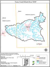 The Treaty Creek-Wabash River Watershed is part of the Middle Wabash-Little Vermilion watershed and covers portions of Miami and Wabash counties. The watershed includes a number of tributaries to the Wabash River from immediately upstream of Lagro, Indiana to immediately upstream of Peru, Indiana. The Wabash River starts in Ohio and drains about 1,600 square miles by the time it gains water from the Treaty Creek-Wabash River Watershed project area.