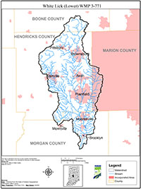 The Lower White Lick Creek Watershed includes drainage area in the southern portion of the greater White Lick Creek Watershed. The Lower White Lick Creek Watershed drains portions of Hendricks, Marion, and Morgan Counties to the East Fork and main stem of the White Lick Creek, just prior to the confluence of the White Lick Creek with the White River. The Lower White Lick Creek study area covers approximately 44 square miles within the greater 290 square mile area of the White Lick Creek Watershed. Both watersheds are located west and southwest of Indianapolis in central Indiana.