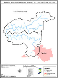 The South Fork Wildcat Creek-Blinn Ditch & Kilmore Creek-Boyle’s Ditch Watersheds are located within the larger Wildcat Creek Watershed in Clinton County, Indiana. The land use of the watersheds is predominately agricultural. The north-west portion of the City of Frankfort and the small community of Kilmore make up the urban and residential areas of the watersheds. Several stream reaches in the watersheds are listed on the Indiana Department of Environmental Management’s 303(d) List of Impaired Waterbodies, and the South Fork of Wildcat Creek is designated as one of three State Scenic Rivers.