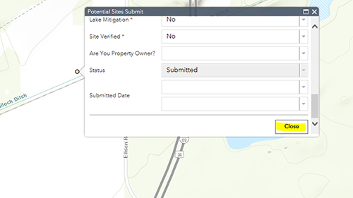 Select Potential Site point and add the point on the map at your location. A box will open for you to add contact and project description information. Please fill this out as complete as possible; when you have completed this, press the Close button.