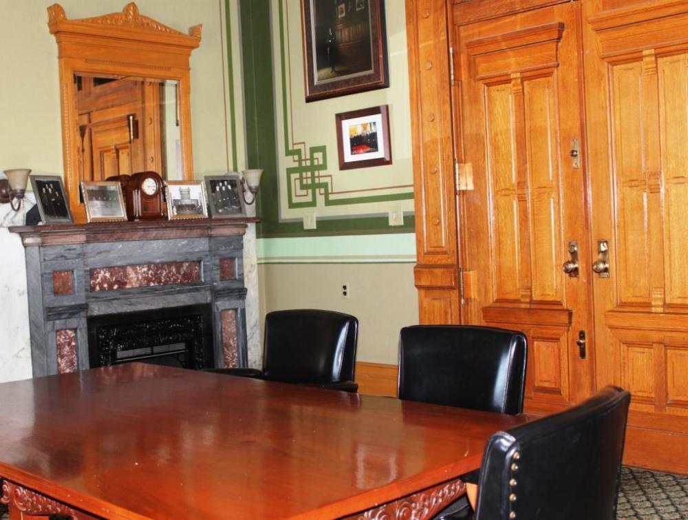 Justices of the Supreme Court meet in this conference room to discuss cases and other court business. The decorative stencil painting was restored in 2007. The wall hangings tell the history of the court since the state’s territorial days.