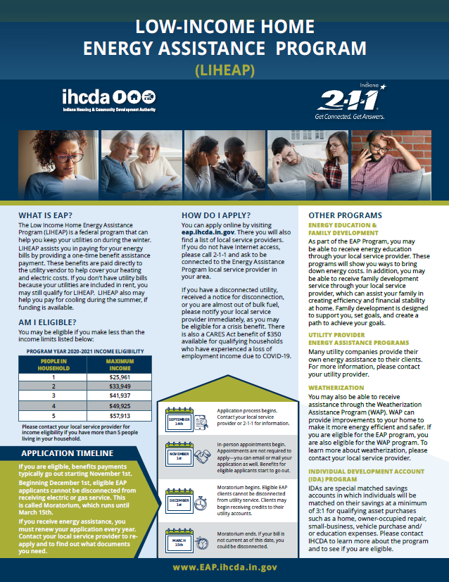 The Energy Assistance Program (EAP) is a federally-funded program through the U.S. Department of Health and Human Services (HHS) called the Low-Income Home Energy Assistance Program (LIHEAP). The program helps more than 100,000 Indiana households pay their heat and electric bills every year. EAP provides a one-time annual benefit that assists qualified households with the high cost of home energy. The program also helps households from having their utilities disconnected.
