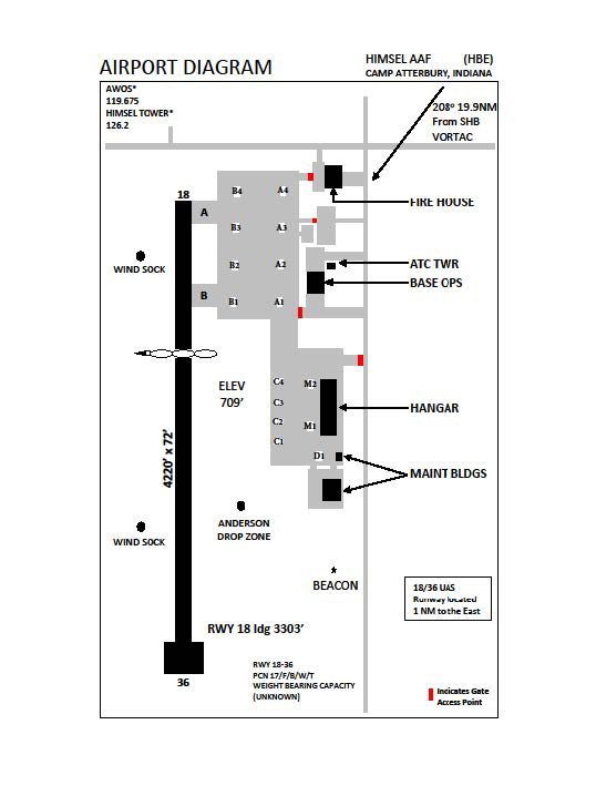 If aircrews arrive unfamiliar with Camp Atterbury, expect to remain clear of the Restricted Area until in position to enter from the north. When cleared to enter the Restricted Area, Tower will direct you to proceed directly to Himsel Army Airfield, land, and receive a ground brief from Airfield Operations prior to conducting flight operations in the Restricted Area.