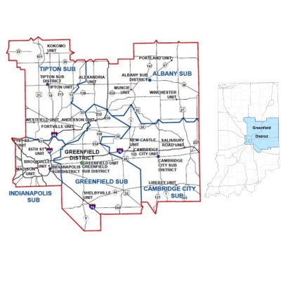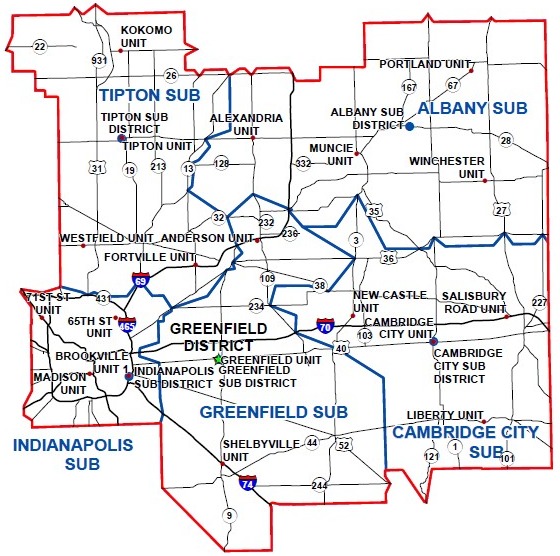 There are five sub districts (Albany, Cambridge, Greenfield, Indianapolis and Tipton) and 15 counties (Delaware, Fayette, Hamilton, Hancock, Henry, Howard, Jay, Madison, Marion, Randolph, Rush, Shelby, Tipton, Union and Wayne) in this east-central Indiana district.