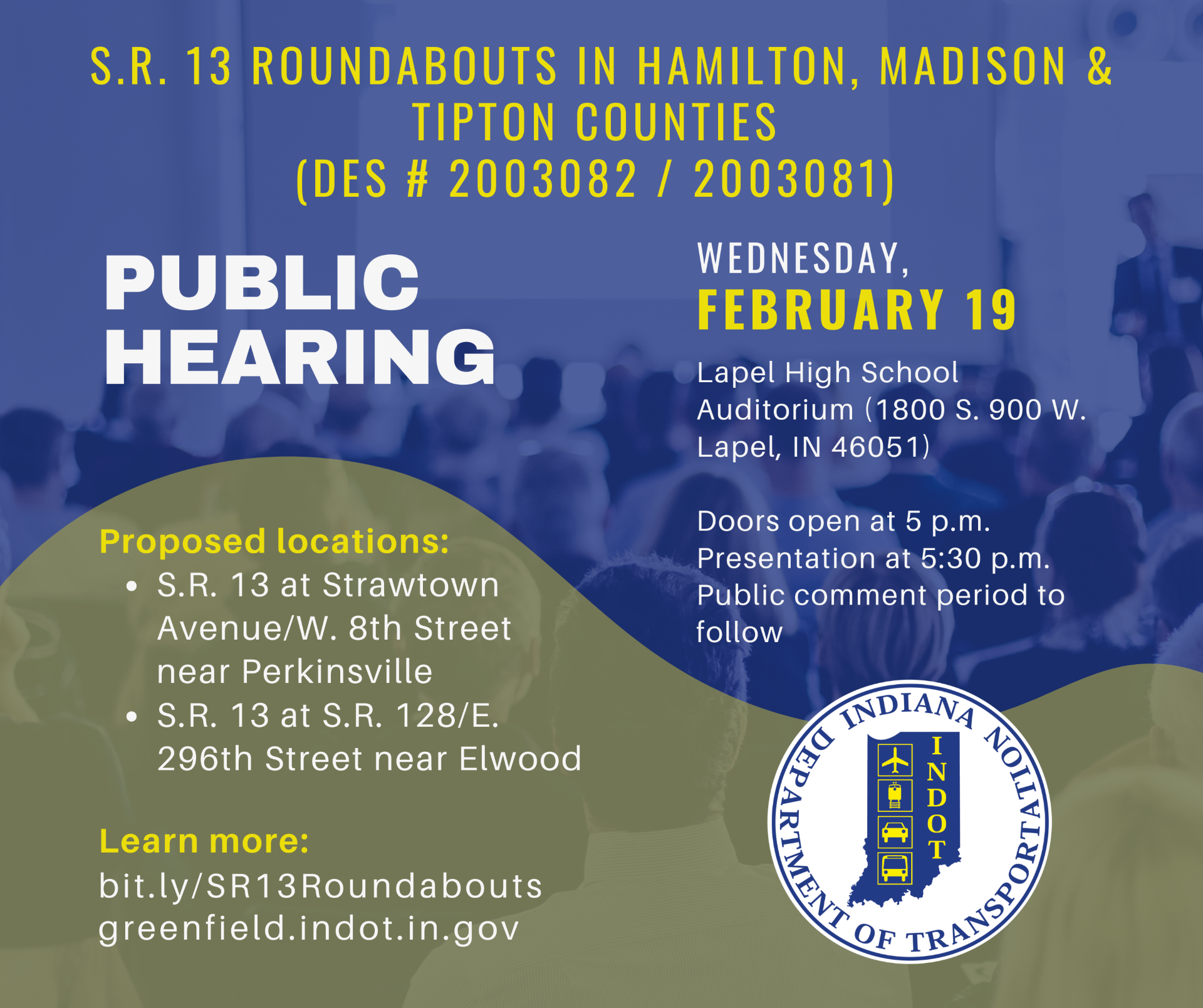 INDOT will host a public hearing on Wednesday, February 19, to inform residents and solicit feedback about two proposed roundabouts on SR 13 at Strawtown Avenue/West 8th Street near Perkinsville (DES. 2003082) and at SR 13 at S.R. 128/East 296th Street near Elwood (DES. 2003081).