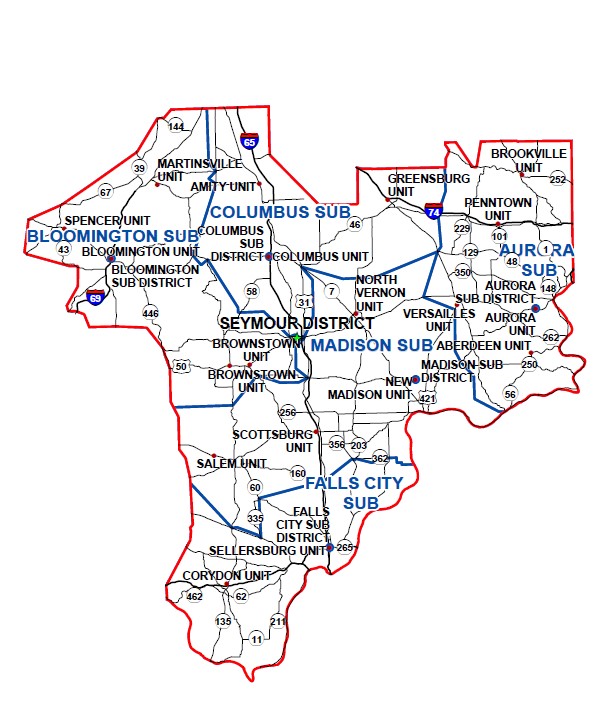 There are five sub-districts (Aurora, Bloomington, Columbus, Falls City, and Madison) and 20 counties (Bartholomew, Brown, Clark, Dearborn, Decatur, Floyd, Franklin, Harrison, Jackson, Jefferson, Jennings, Johnson, Monroe, Morgan, Ohio, Owen, Ripley, Scott, Switzerland and Washington) in this southeast Indiana district.