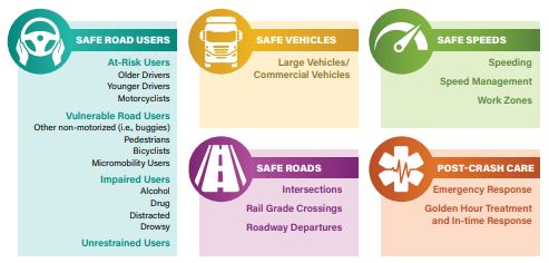 The previous SHSP, created in 2016, listed a dozen emphasis areas. The new plan reduces that number to five (safe road users, safe vehicles, safe roads, safe speeds, and post-crash care) but adds more action plans. There are now 11 action plans regarding: vulnerable users, younger and older drivers, impaired drivers, occupant protection, commercial motor vehicles, roadway departure, intersections, rail-highway grade crossings, speeding, work zones, and post-crash care for road users and incident management partners.