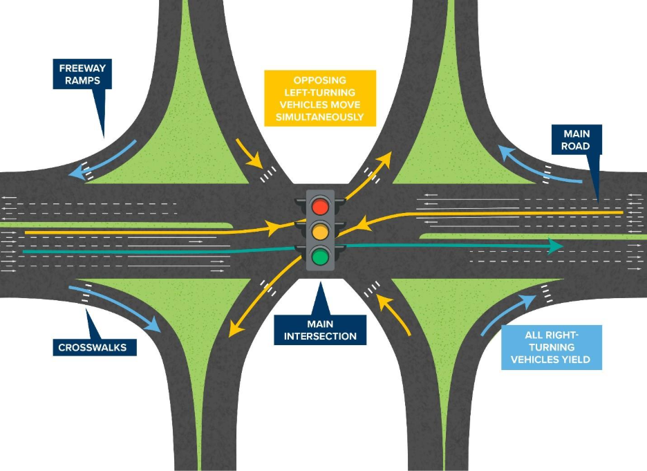 The design allows for left-turning vehicles coming from opposing directions to turn simultaneously, without crossing paths. This enhances safety by reducing the number of places where vehicles cross paths and improves efficiency by allowing more vehicles to drive through the intersection during a signal cycle. Right-turn movements onto and off the freeway ramps are guided by stop or yield signs, away from the main intersection. A SPUI can be designed with the freeway passing over or under the intersection. Pedestrians use marked crosswalks to safely cross the freeway ramps, and bicyclists may use pedestrian paths or follow the flow of traffic.