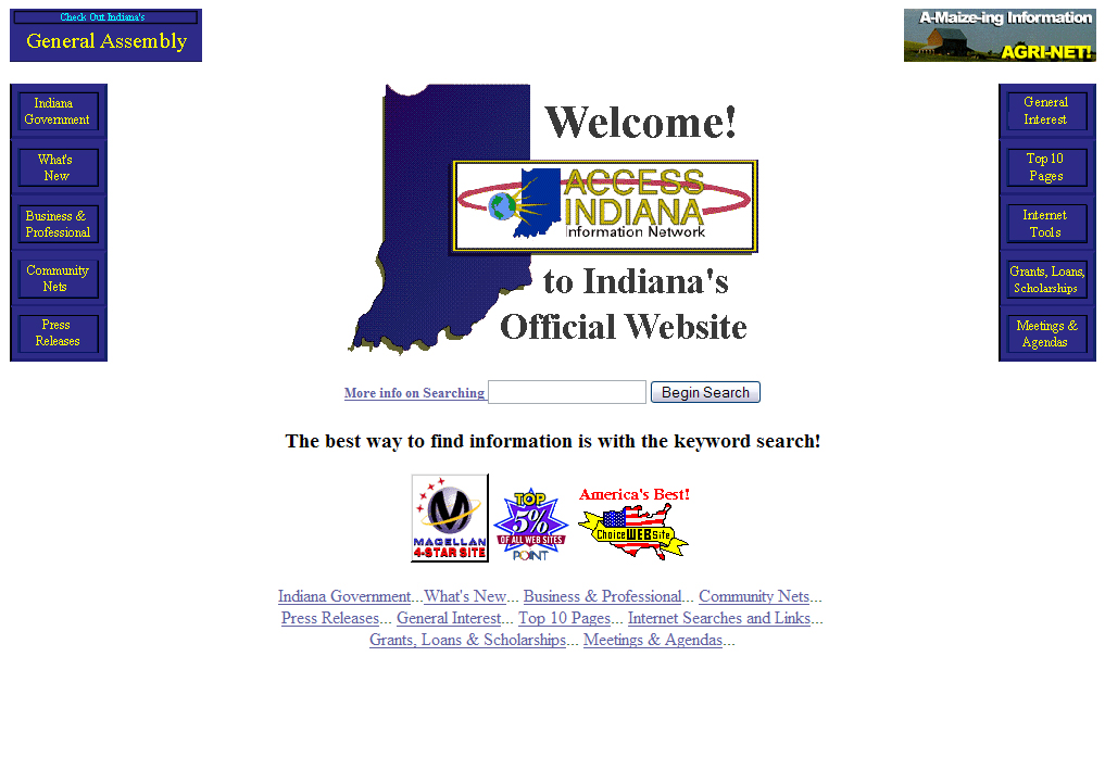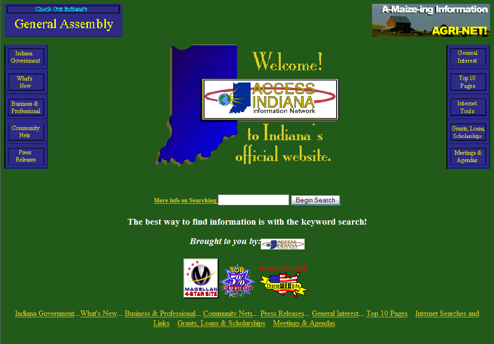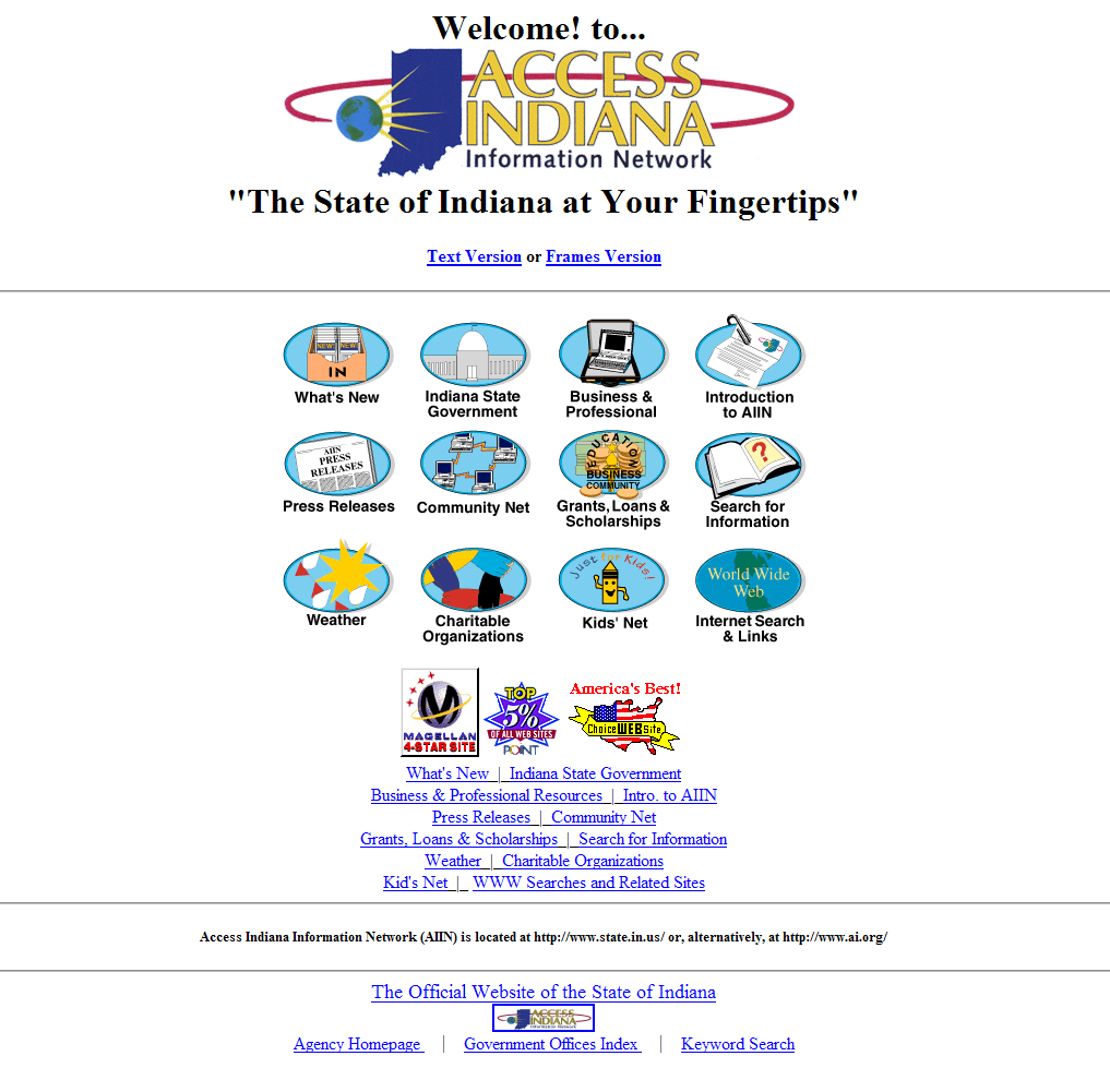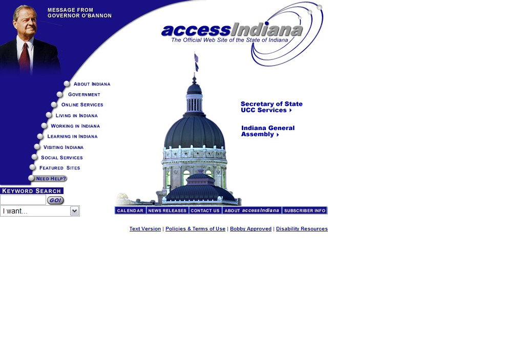 accessIndiana, the moniker of IN.gov until 2006, launched in 1995 and offered only one online service - BMV driver license searches. Its simple design is representative of the early stages of Web design and development.