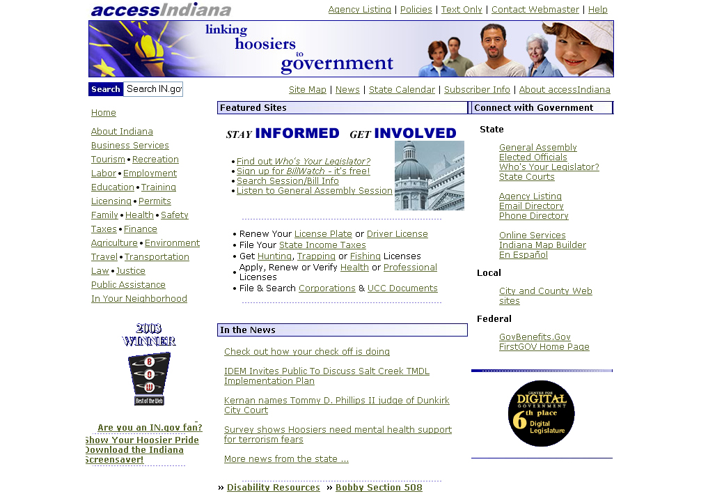 In 2001, Indiana was the first state to attempt a common look and feel initiative. Information across accessIndiana was presented with similar design, structure and navigation, allowing site visitors to easily navigate through the site. accessIndiana also began accepting credit card payments for online services - a convenience that is still exciting to many Hoosier citizens and businesses today. accessIndian's efforts earned 1st place in the Brown University e-Government Study in 2001 and 4th place in 2002 and 3rd place in 2003 in the Center for Digital Excellence Best of Web Competition.