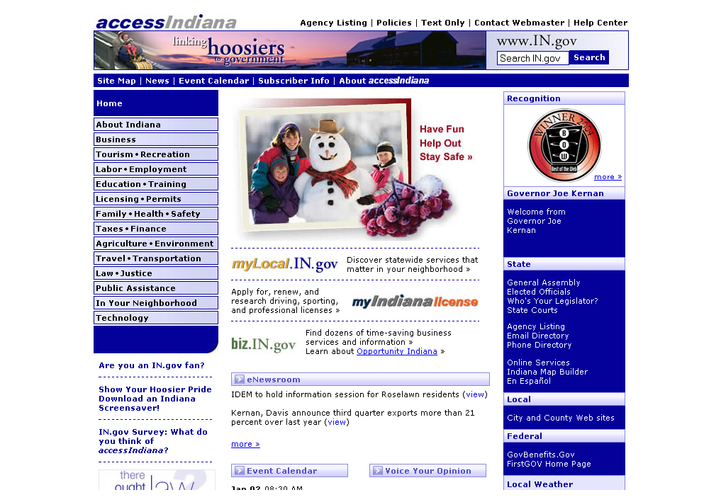 accessIndiana's online service offerings grew even more with the launch of the nation's first online certified record and verification search for driving records and the health professional license renewal service that realized a 70% adoption rate in its first year. Indiana's official Web site also climbed the charts in the Best of Web Competition when it was awarded 2nd place in 2004.