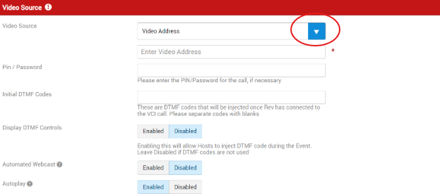 - Scroll down, under Video Source, click the drop-down arrow and select Video Address from the dropdown. The information entered here will vary depending on which meeting type you are using.