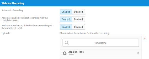 - Hosts & Moderators - If you would like to add alternate host or moderators, you’ll do that here. Click find items, type the person’s name and click on them. You’ll see a check by their name, then when you click off the drop down you will see them listed like you see “Jessica Hege”