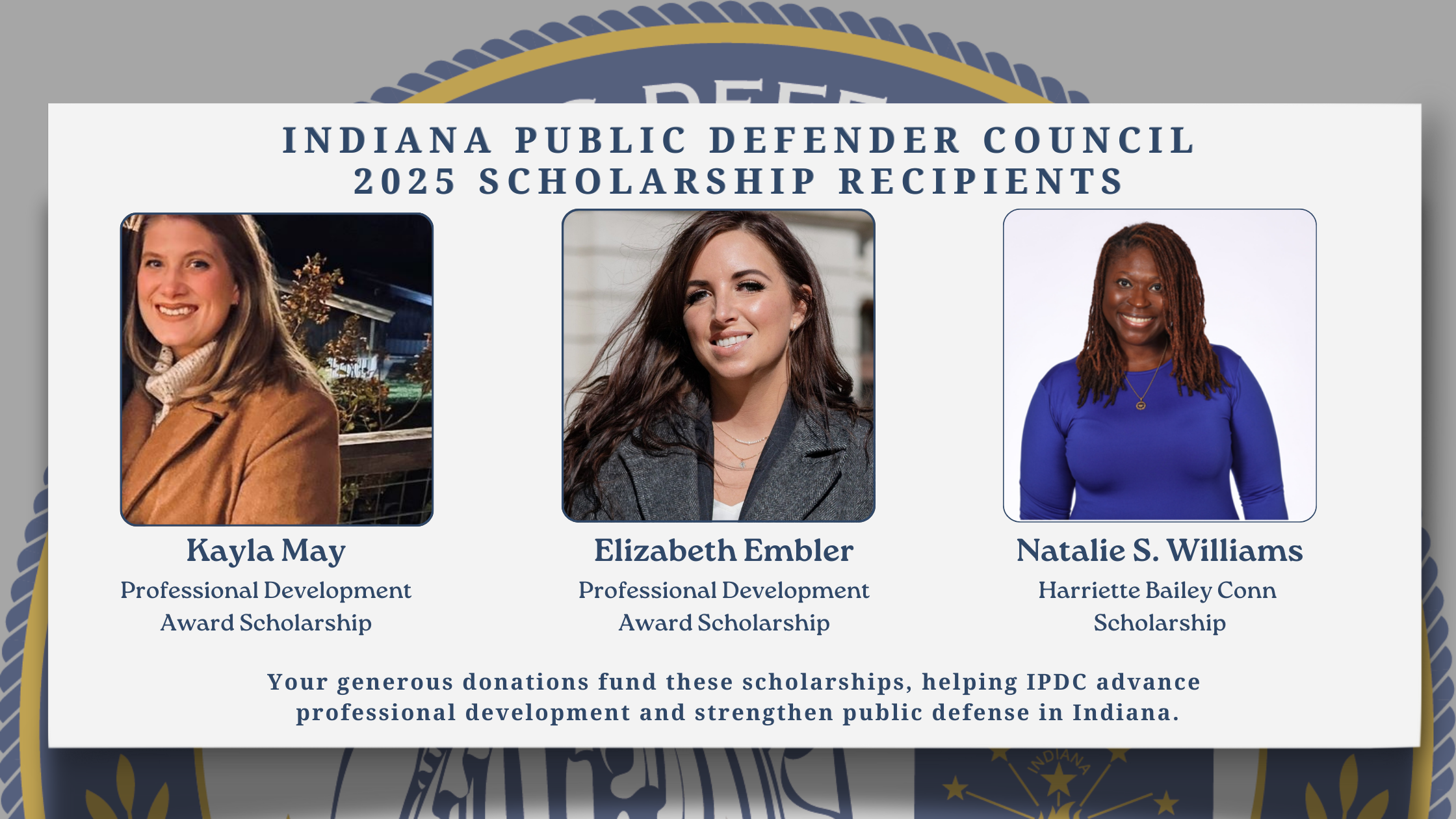 The Indiana Public Defender Council (IPDC) is pleased to announce our 2025 Scholarship recipients! Thanks to your generous donations, IPDC is able to support the professional development of exceptional public defenders across the state. This year, the IPDC Board has selected three outstanding recipients: Kayla May, Elizabeth Embler, and Natalie S. Williams.