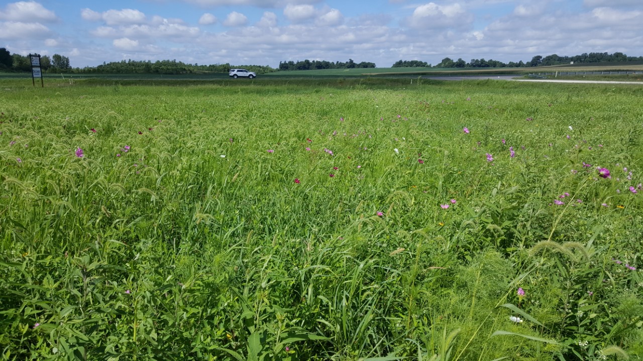 Solar Sources donated the plot of land at their entrance for this project with Dave Howell of Covey Rise Enterprise preparing and planting the site. The first steps included spraying to kill the current grasses growing. This took time or two to accomplish. The site was then tilled and planted with an NRCS approved mix of native grasses & pollinating plant. In the future, the SWCD will look at installing bee boxes for honey production as it could take up to two years for the plot to become established enough with pollinating plants to sustain a bee colony.