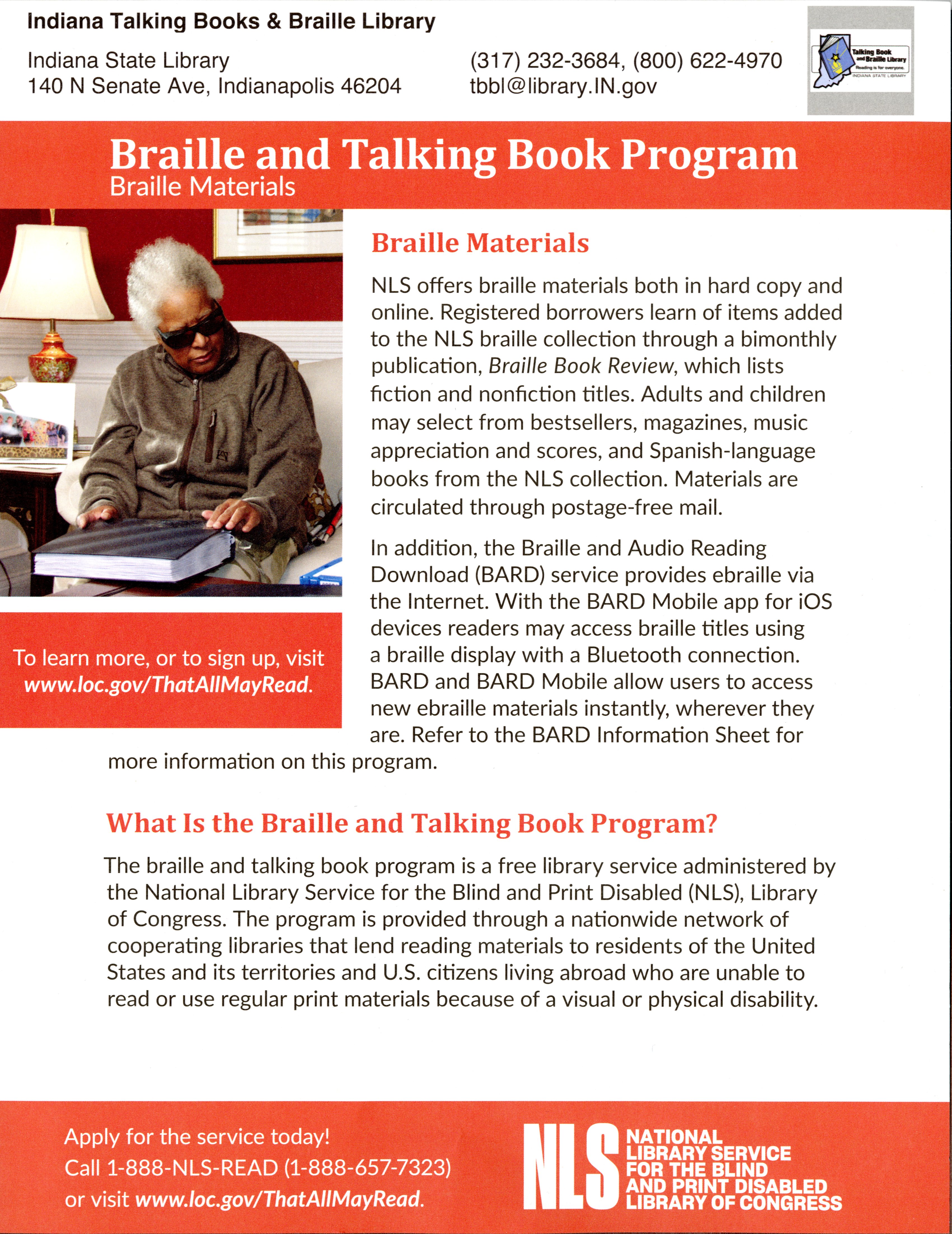 The National Library Service for the Blind and Print Disabled (NLS) provides equipment free of charge to those patrons who need devices to play NLS audiobooks and magazines or read electronic braille materials. NLS also provides information for patrons who want or already have their own mobile devices or commercial equipment for using NLS materials. Network libraries circulate NLS playback equipment through the mail for free and can offer some assistance to patrons using their own mobile devices and other equipment. For more information about the Indiana Talking Book & Braille Library please visit the entire webpage at www.library.in.gov/tbbl/