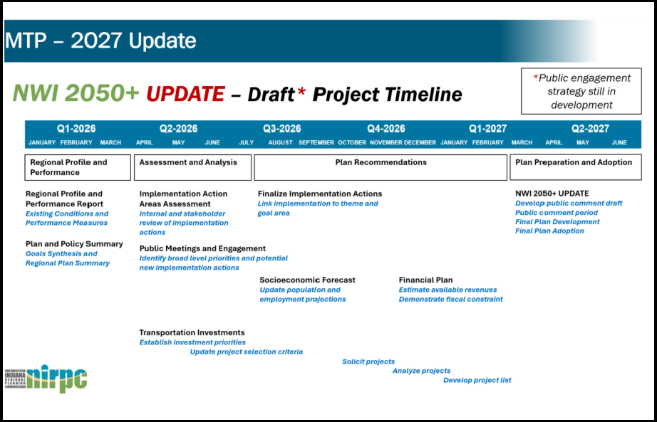 NIRPC adopted its current MTP NWI 2050+ on July 20, 2023. NIRPC staff have begun the process of updating NWI 2050+. The plan update is intended to build upon the vision of previous plans. It will carry over major goals and maintain the horizon year of 2050 but will incorporate new data and forecasts and public and stakeholder feedback to focus on specific implementation actions that NIRPC and its partners can take to advance these goals.