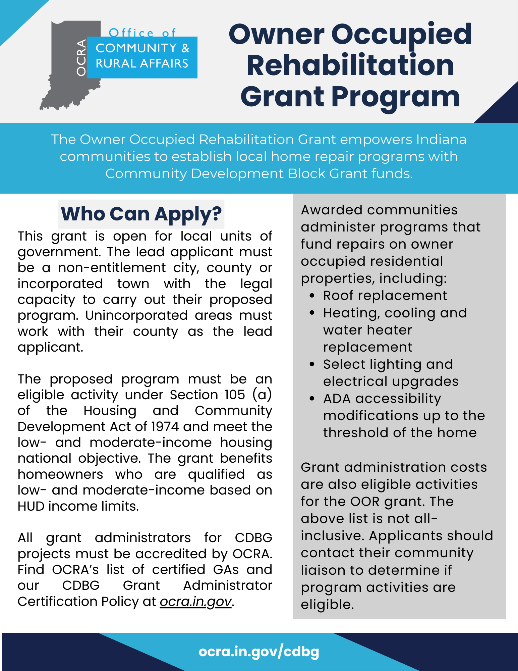 OCRA’s CDBG Owner Occupied Rehabilitation Grant opened for applications on April 14, 2025.