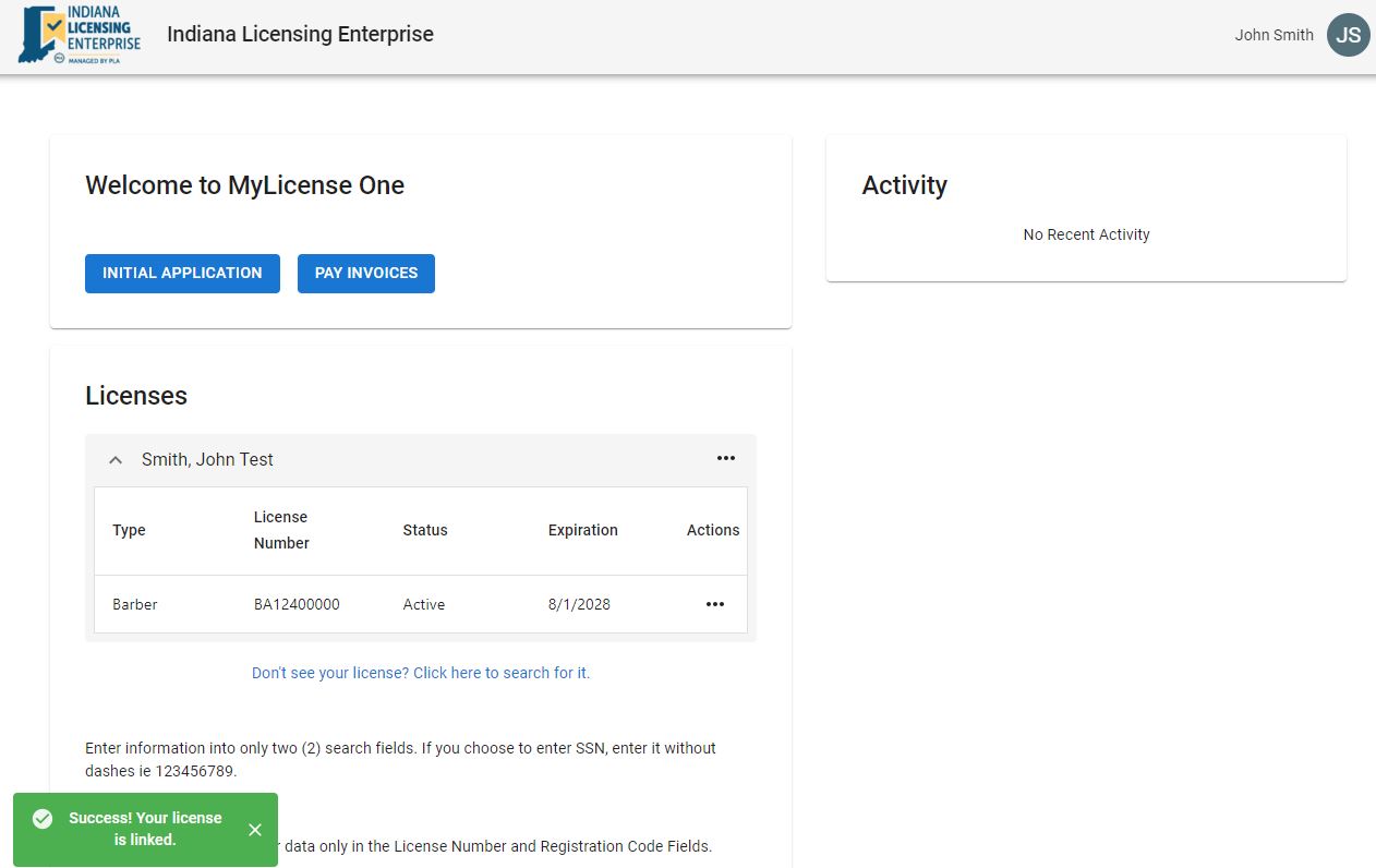 Successful linking message appears and you may now take Action on your existing license OR Apply for a new License.