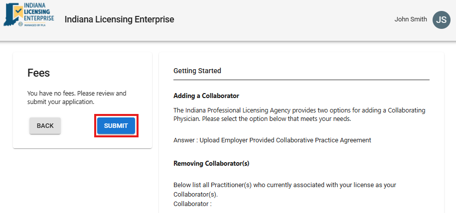 - Enter Name, license number, and the date of termination for any collaborator(s) you wish to remove.