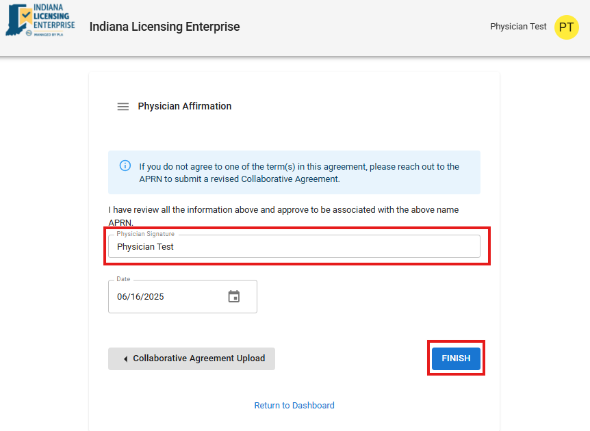- The Physician Affirmation must be completed by the Practitioner. The APRN must select the FINISH button to proceed to the summary page and final step.