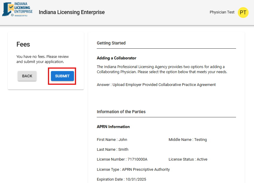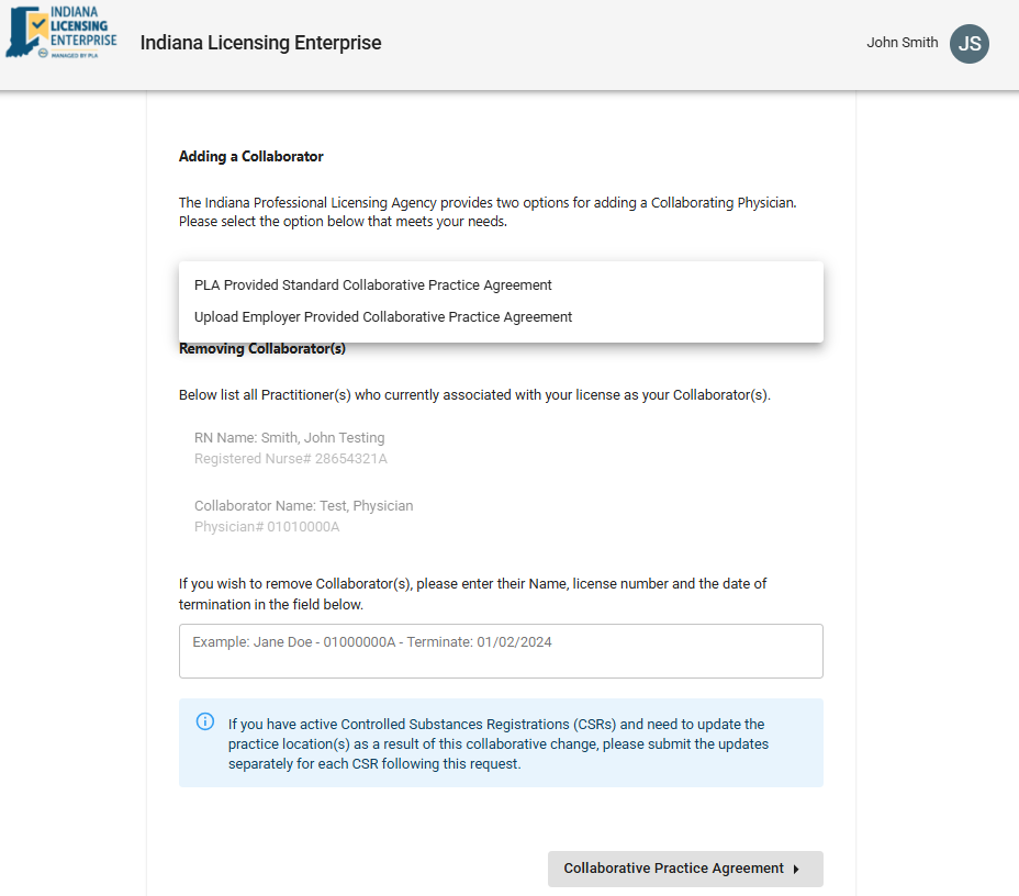 Upload Collaborative Practice Agreement: This option will allow you to complete some basic information online and then upload the collaborative agreement document (do not upload multiple documents separately.) This option will not require Step 3 with a Physician Affirmation.